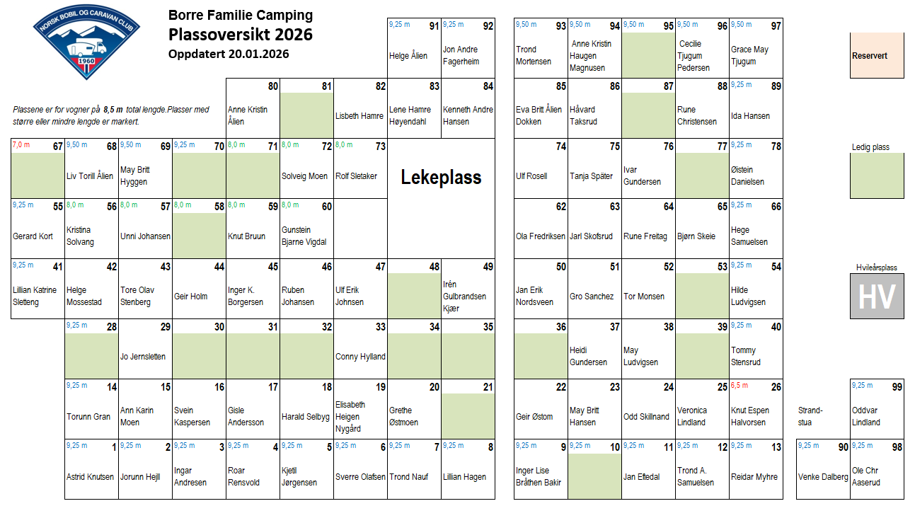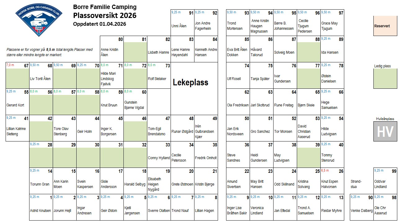 Under finner du gjeldende plasskart. Lengden på hver plass er 8,5 m.
